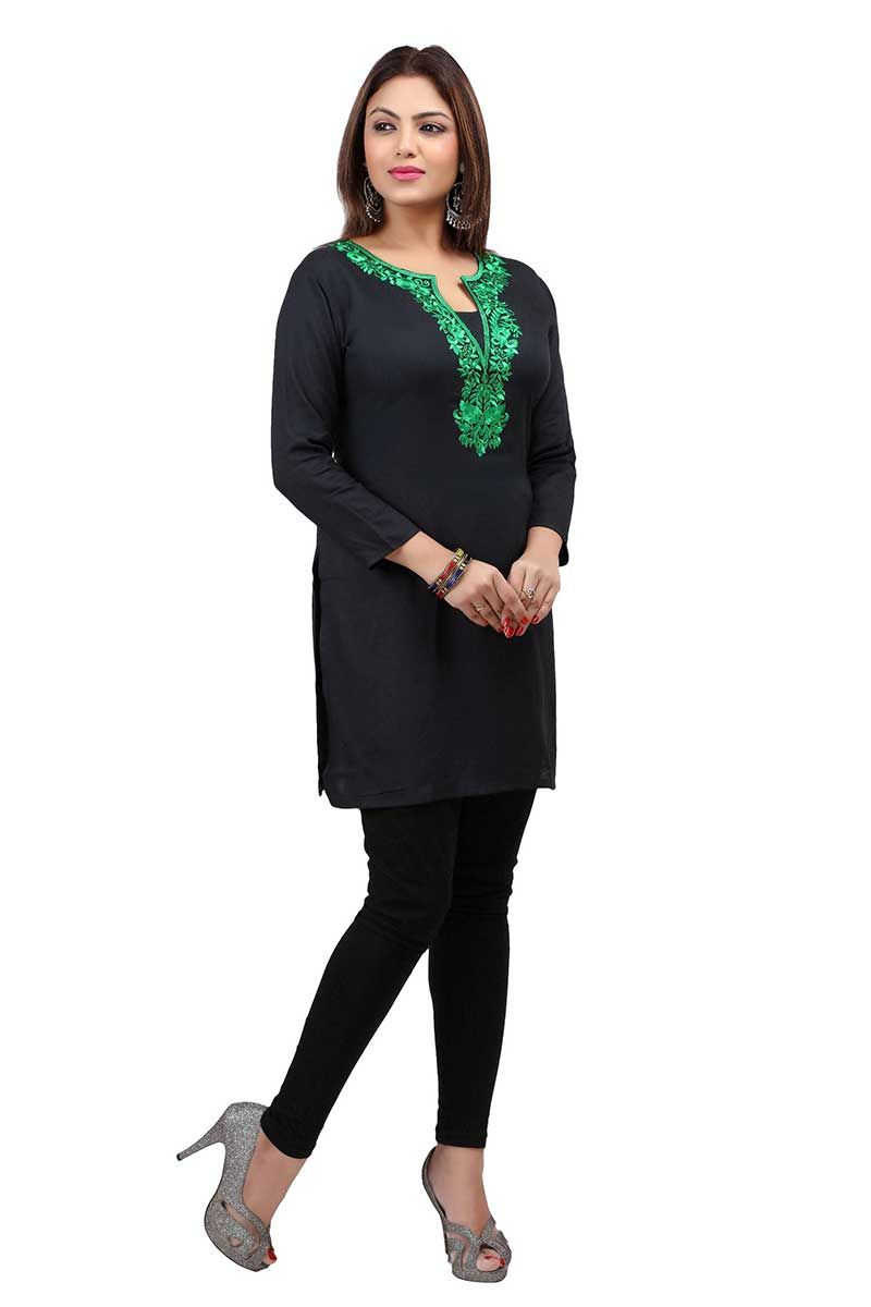 Stylish Black Kurti with Green Neck and Full Sleeves Perfect for Everyday Casual Wear Sizes S XL